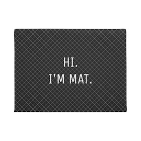 "Hi. I'm Mat." Funny, humorous, modern, checkered pattern, non-slip rubber backing, black color, covered outdoor / indoor / entrance door mat, for a fun, cool entrance.